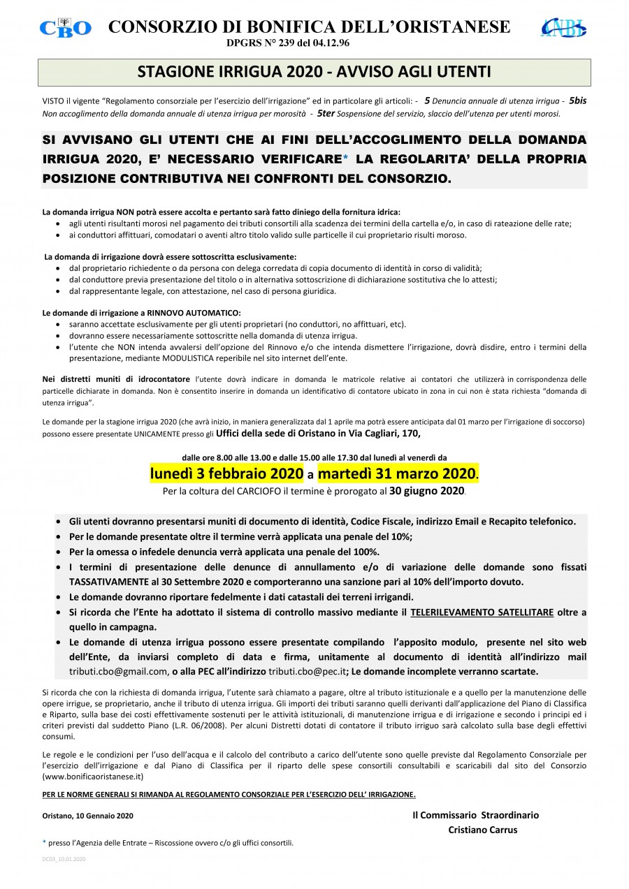 Le domande per la stagione irrigua 2020 (che avrà inizio, in maniera generalizzata dal 1 aprile ma potrà essere anticipata dal 01 marzo per l’irrigazione di soccorso) possono essere presentate UNICAMENTE presso gli Uffici della sede di Oristano in Via Cagliari, 170,
