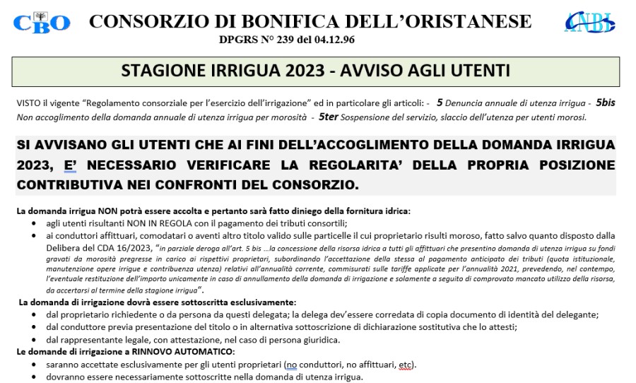 SI AVVISANO GLI UTENTI CHE AI FINI DELL’ACCOGLIMENTO DELLA DOMANDA IRRIGUA 2023, E’ NECESSARIO VERIFICARE LA REGOLARITA’ DELLA PROPRIA POSIZIONE CONTRIBUTIVA NEI CONFRONTI DEL CONSORZIO.
